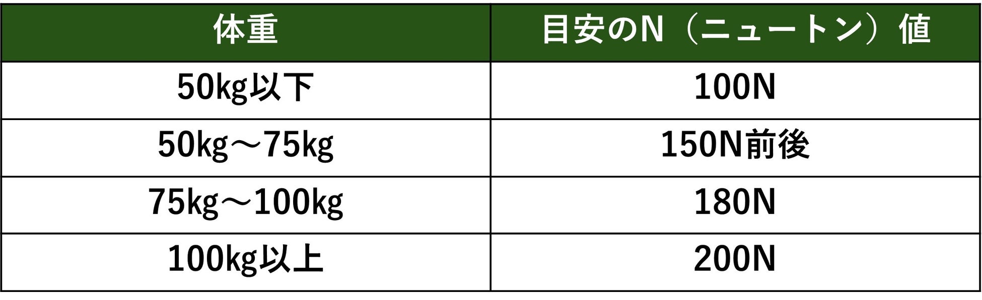 ウレタンマットレスの硬さは40N〜200N以上と幅広いですが、体重別におすすめのニュートン値は表の通りです。
