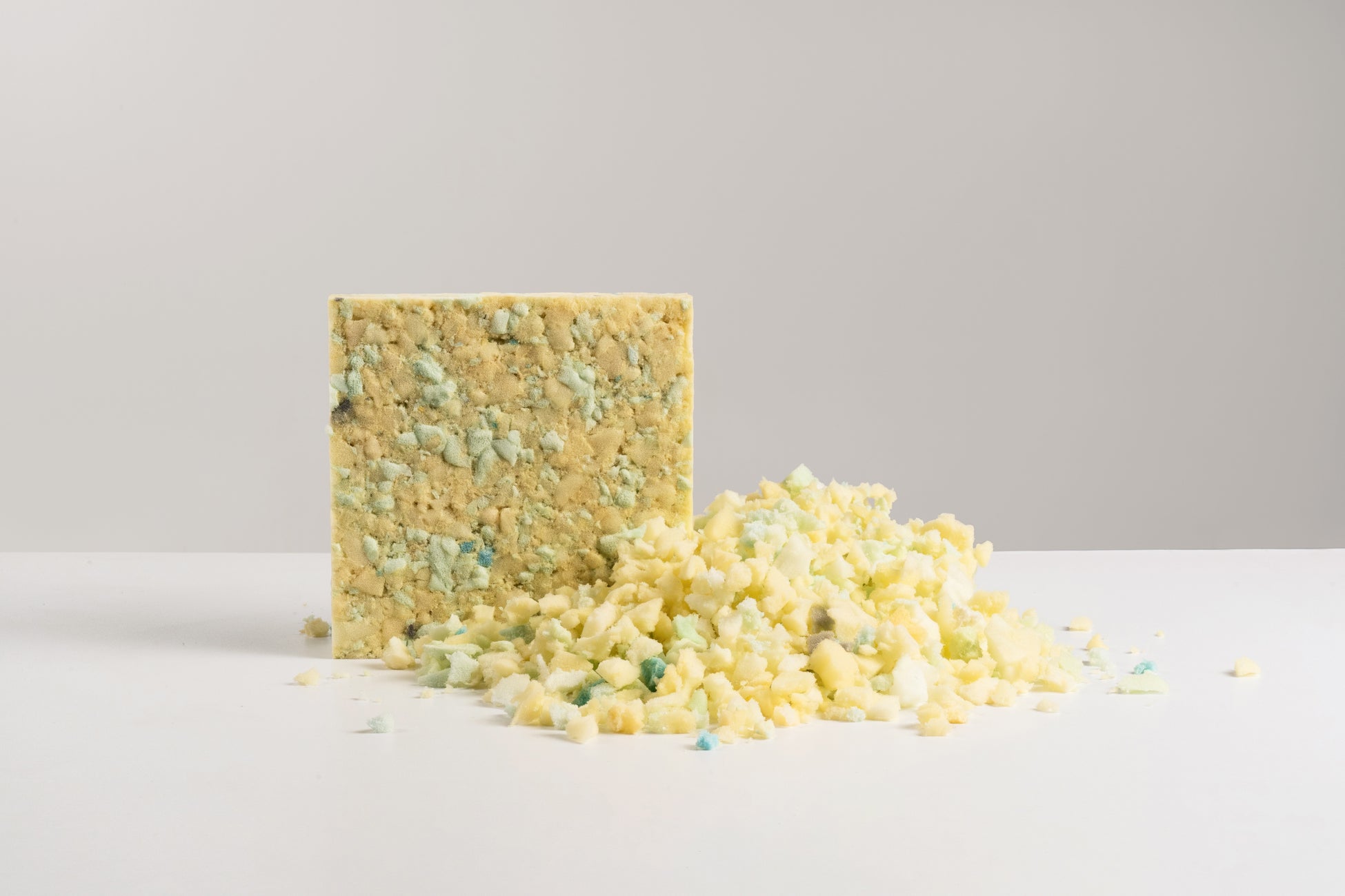 マットレスなどのフォームの端材を粉砕し、圧縮して固めることでクッションのほか、パッケージの緩衝材やフォームへ再利用しています。